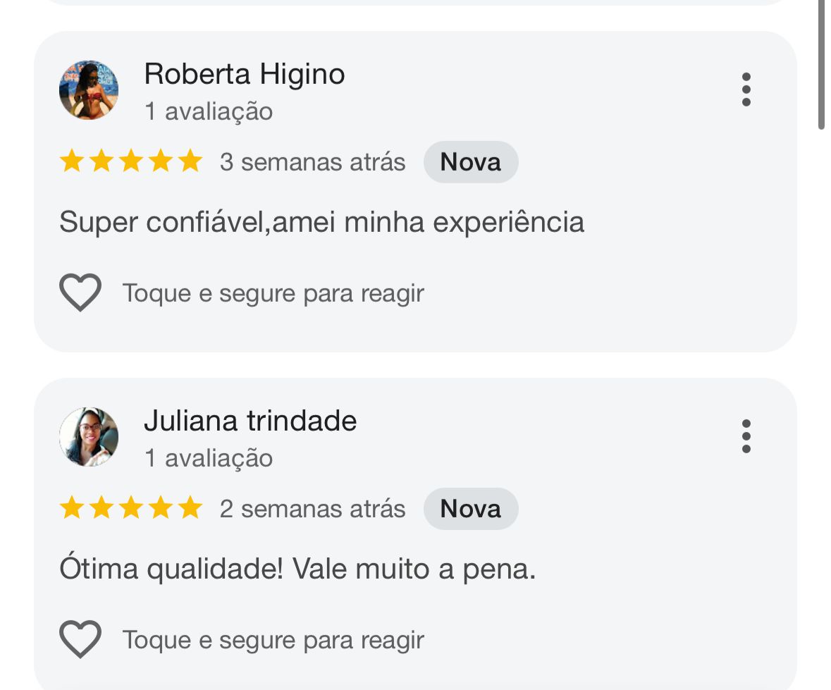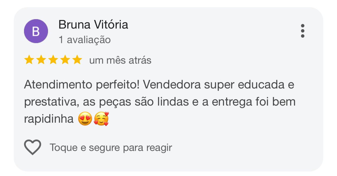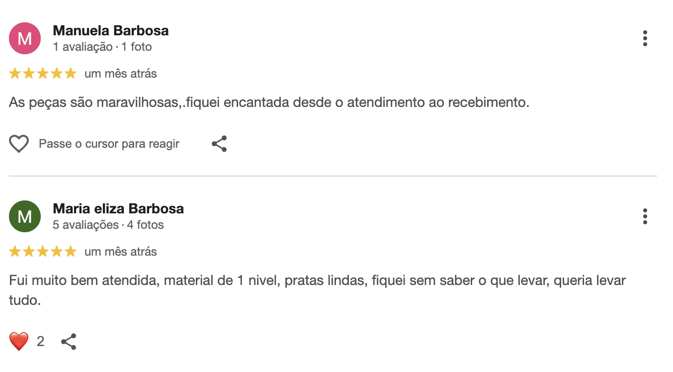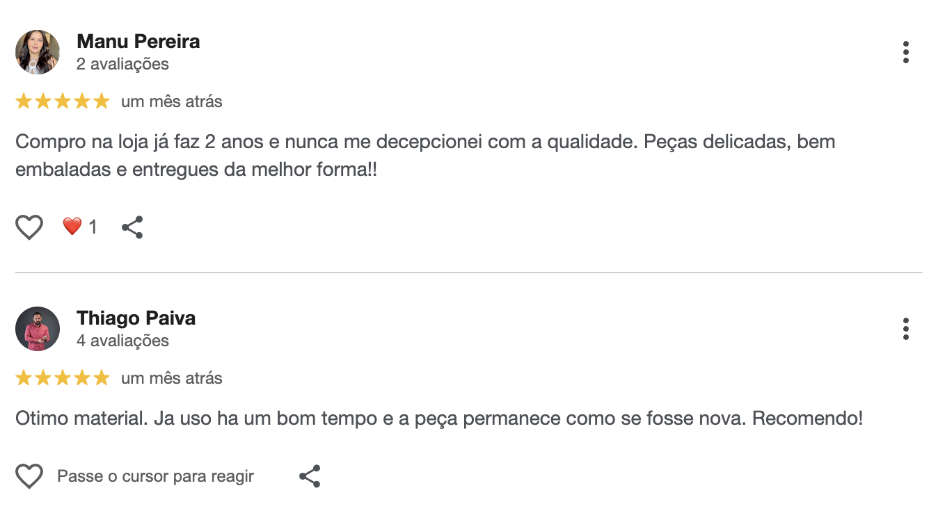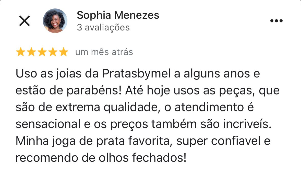 Essas são algumas das nossas avaliações. Você pode conferir mais no destaque "Prateadas" no nosso instagram (@pratasbymel) ou nas avaliações google colocando o nosso nome do buscar.